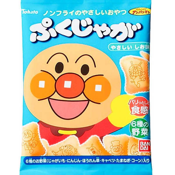야채를 6 종 함유하고 바삭 바삭한 식감에 구운 감자 스낵입니다.간식 호빵맨의 인기 캐릭터를 프린트했습니다.먹을 때마다 캐릭터의 이름을 부르고 즐길 수 있습니다. 도안은 전부 33 종류.감자를 기반으로 한 원단에 야채의 단맛을 더한 어린이 친화적 인 맛으로 완성했습니다.소분 편리한 파우치 4 연속 포입니다.
