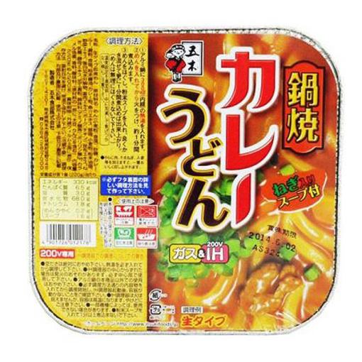 원자재 : 국수 (밀가루, 소금), 설탕, 카레, 전분, 소금, 분말 간장, 카레 가루, 해산물 추출물, 돼지 기름, 밀가루, 분말 유지, 야채 추출물, 단백 가수 분해물, 축육 엑기스 (돼지 고기, 닭고기), 다시마 추출물 , 파, 유당, 효모 추출물 / 가공 전분, 조미료 (아미노산 등), 폴리 인산 Na, 캐러멜 색소, 향료, 산미료, (원재료의 일부에 밀, 우유 성분, 콩, 돼지 고기, 닭고기, 사과, 참깨 포함) 영양 성분 : (1 인분 (220g) 당) 에너지 330kcal, 단백질 6.0g, 지질 3.0g, 탄수화물 68.4g, 식염 상당량 4.6g (국수 화약 0.5g 스프 4.1g) 내용 카테고리 : 일반 식품, 인스턴트 식품,鍋?우동 크기 : 170~230 (g, ml) 유통 기간 (업체 제조 일로부터) 7 개월