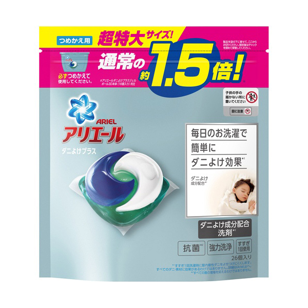 ● “애리 진드기 차양 플러스 젤 공 3D ‘(애리 세탁 세제 젤 공 3D 진드기 차양 플러스)의 리필 용입니다. 일반적으로 약 1.5 배 * 1의 초대형 사이즈입니다.● 매일 세탁으로 쉽게 진드기 차양 효과 * 2● 진드기 방충제 성분 배합 세제 * 2● 항균 * 3● 강력한 세척● 헹굼 1 회 사용● 깨끗한 신선한 향기● 애리 거실 드라이 젤 볼과 동등한 세척 힘이기 때문에, 평소 세탁에도 사용하실 수 있습니다.※ 모든 평균 세탁 물량 (P & G 검사)시.* 1 애리 진드기 차양 플러스 젤 공 3D 본체 (16 개들이) 대비* 2면 소재에 대해 린스 1 회 세탁시 실내 진성 진드기를 다가가려 어렵습니다. 모든 진드기 울트라 얇은면 소재에 효과가있는 것은 아닙니다.* 3 모든 균의 증식을 억제하는 것은 아닙니다.【사용 방법】※ 본 제품은 리필 용입니다. 반드시 애리 진드기 차양 플러스 젤 공 3D의 본체 용기에 리필하여 사용하십시오.★ 세탁기 표시 : 세탁 수량 (세탁 물량)· 30L~65L (2kg~6kg) : 본 제품 1 마리· 65L 이상 (6kg 이상) : 본 제품 2 마리를 추천합니다.※ 올바른 사용을 위해 상기 설명 된대로 사용하십시오.드럼 세탁기에서 2 마리 사용시 헹굼 시간이 길어질 수 있습니다.★ 세탁 조언* 헹굼 1 회 사용하십시오.* 세척 전에 의류의 취급 그림 표시를 확인하십시오. 울이나 섬세한 의류 등 그림 표시가있는 의류 (※ 본 제품 뒷면에 기재)에는 사용하지 마십시오.* 수 나름대로이나 밝은 색옷 “무 형광 세제 사용”표시가있는 의류는 형광 물질을 포함하지 않는 세제로 세탁을 권장합니다.★ 보관 방법· 사용시 본체 용기에 넣어 보관하십시오.· 리필 나머지는 반드시 지퍼를 꼭 닫아 보관하십시오. 또한 저장 중에는 고온 다습 직사 광선을 피하고 서둘러 사용하십시오.【재료】 계면 활성제 (64 % : 직쇄 알킬 벤젠 술폰산 염, 폴리 옥시 에틸렌 알킬 에테르, 알킬 황산 에스테르 염, 순 비누 분 (지방산 염)), 안정제 (프로필렌 글리콜), 진드기 방충제 성분, 분산제 금속 봉쇄 제, 형광 증 백제, 향료, 물 연화제, 효소 [사양 개요】 품명 : 세탁 용 합성 세제용도 :면, 마, 합성 섬유 용액성 : 중성실중량 : 556g (26 개입) 【주의 사항】★ 사용상의주의· 이것은 음식이 아닙니다.· 어린이나 애완 동물의 손이 닿는 곳에 두지 않는다.· 입에 넣고 삼켜거나하지 않는다.· 치매 분 등의 섭취를 방지하기 위해 넣어야에주의한다.* 용도 이외에는 사용하지 않는다.· 애벌 빨래 나 화장실에 추천하지 않습니다.· 제품을 강하게 누르거나 장시간 만지지 마십시오.* 원액이 직접 세탁기 고무와 뚜껑 부분에 닿지 않도록한다. 묻 으면 물로 즉시 닦아.· 작게 해 버리고 쉬운 부드러운 소재를 사용하고 있습니다. 개봉 전의 파손이나 누출에주의하여 취급하십시오.· 단면과 모서리에 손을 베지 않도록주의하시기 바랍니다.패키지 뒷면 중앙의 작은 구멍은 외부 부대의 팽창을 막기위한 통풍구입니다. 제품 및 패키지의 품질에 문제가 없으므로 안심하십시오.
