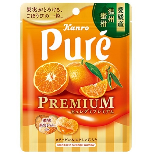 **칸로 퓨레구미 프리미엄 에히메산 운슈밀감 (Kanro Pure Gummy Premium Ehime Unshu Mikan)**은 일본 에히메현에서 생산된 고품질 운슈밀감(온주귤)의 진한 풍미가 담긴 프리미엄 젤리입니다!
