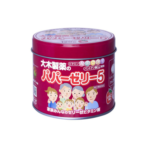 제품 설명 상품 소개 빠빠제리 5는 비타민 A, B6, C, D2, E와 판토텐산 칼슘을 배합 합친, 물고 쉽게 복용하실 딸기 맛 달콤한 젤리 비타민입니다. 어린이가 감기 등의 발열이나 설사 등으로 녹초가있을 때나 식사가 진행되지 않는 경우 등의 영양 공급에 적합합니다. 또한 부드러운 때문에 단단한 것을 싫어하는 노인 에게도 추천 할 수 있습니다. 의약품의 판매에 대해 ● 사용상의주의■■하지 말라 ■■ (지키지 않으면 현재의 증상이 악화되거나 부작용 사고가 발생하기 쉽습니다.) 다음 사람은 복용하지 마십시오. ● 본 물질은 유아 (1 세 미만)에 복용하지 마십시오. ■■ 상담 할 ■■ 1. 다음 사람은 복용 전에 의사, 약사 또는 등록 판매자에게 상담하십시오. (1) 의사의 치료를 받고있는 사람. (2) 임신 3 개월 이내의 임산부, 임신하고 있다고 생각되는 사람 또는 임신을 희망하는 사람. (임신 3 개월 전부터 임신 3 개월까지 비타민 A를 1 일 10,000 국제 단위 이상 섭취 한 임산부에서 태어난 아동에 선천 이상의 비율이 상승했다는 브로드 경고가 있습니다.) 2. 복용 후 다음 증상이 나타난 경우에는 부작용의 가능성이 있으므로 즉시 옷 을 중단하고 본 용기를 가지고, 의사, 약사 또는 등록 판매자에게 상담하십시오. ● 피부 … 발진 발적, 가려움 소화기 … 구역질 · 구토, 설사 3.1 개월 정도 복용해도 증상이 나아지지 않으면 복용을 중지하고 본 용기를 가지고, 의사, 약사 또는 등록 판매자에게 문의하십시오. ● 효능 효과유소아의 발육기 · 편식 아동 · 병중 병후 식욕 부진 영양 장애 발열 성 소모성 질환 등의 경우 영양 보급, 자양 강장, 허약 체질 ● 용법 용량● 성인 (15 세 이상 ) 2 마리, 소아 (1 세 ~ 14 세) 1 마리를 1 일 1 회, 수시 복용하십시오.1 세 미만 복용하지 마십시오. <용법 용량에 관한주의> (1) 유아 (1 세 미만)에 복용하지 마십시오. (2) 반드시 씹어 서 복용하십시오. (3) 정해진 용법 용량을 준수하십시오. (4) 유아 (1 세 ~ 6 세)에게 복용시킬 경우에는 목에 시중 않도록주의해서 하십시오. (5) 어린이에게 복용시킬 경우에는 보호자의지도 감독하에 복용시켜주십시오. ● 재료 분량1 일량 (2 마리 중) 성분 ··· 분량 비타민 A 유 (비타민 A 4,000 국제 단위) … 4mg 비타민 D2 … 0.01mg 비타민 E 초산 에스테르 … 5mg 비타민 B6 … 1mg 비타민 C … 40mg 판토텐산 칼슘 … 6mg 첨가제로, 물 사탕, 흰 설탕, 한천, 펙틴, 적색 106 호, 향료, 기타 2 성분을 함유한다. ● 보관 및 취급주의(1) 직사 광선을 피하고되도록 습기가 적은 서늘한 곳에 보관하십시오. (2) 소아의 손이 닿지 않는 곳에 보관하십시오. (3) 오용을 피하고 품질을 유지하기 위해 다른 용기에 바꾸어 넣지 마십시오. (4) 사용 기한 (본 용기의 바닥에 기재되어 있습니다)이 지난 것은 복용하지 마십시오. (5) 본제는 젤리 타입이기 때문에 보관 상황에 따라 변색이나 균열이 발생 할그리고 있지만, 의약품의 본질에는 문제가 없으므로 그대로 복용하십시오.