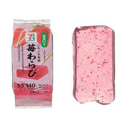 딸기 퓨레를 사용하여 딸기의 신맛, 새콤달콤한 맛과 쫀득쫀득한 식감을 한 손으로 간편하게 즐길 수 있는 딸기맛 와라비 떡입니다.